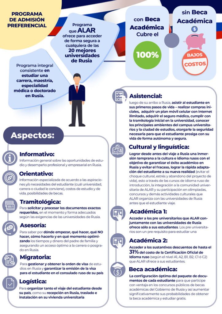 Es un programa integral que ALAR propone a todo aquel que tiene grandes sueños, metas altas y un resuelto espíritu de conocer el mundo y su gente, nuevas culturas, y que está dispuesto a hacerlo en las universidades del país más grande del mundo y una de las mayores potencias – Rusia.